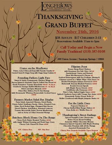 Thanksgiving Grand Buffet Annual Thanksgiving Grand Buffet with variety of menu choices, including gluten free and nut free items. Set a Reminder Enter your email address below to receive a reminder message. Email address Select the amount of Days before the event -- Select Days Before Event -- 1 Day 2 Days 3 Days 1 Week Captcha Validation Please complete the Captcha Submit Date and Time Thursday Nov 24, 2016 11:00 AM - 5:00 PM EST Thursday November 24 11am-5pm Location Longfellows Restaurant Fees/Admission $38 Adults, $17 Children ages 3-12 Set a Reminder Enter your email address below to receive a reminder message. Email address Select the amount of Days before the event -- Select Days Before Event -- 1 Day 2 Days 3 Days 1 Week Captcha Validation Please complete the Captcha Submit Share × Print Email Add to Calendar Facebook Twitter LinkedIn Tell a Friend × Select Calendar Type × Google Yahoo iCal (Outlook, Apple, or other)