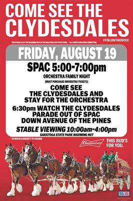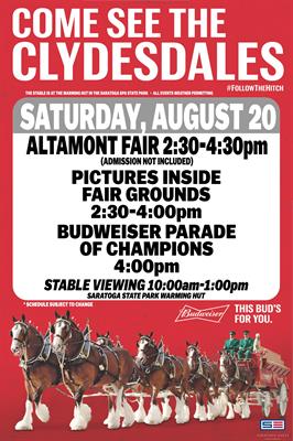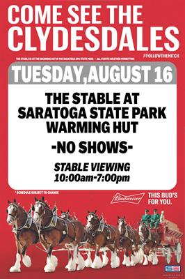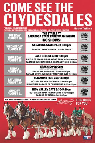 The Clydesdales will be stabled at the Warming Hut area of the Saratoga Spa State Park. They will have events in Saratoga, Lake George, Troy, and Altamont.